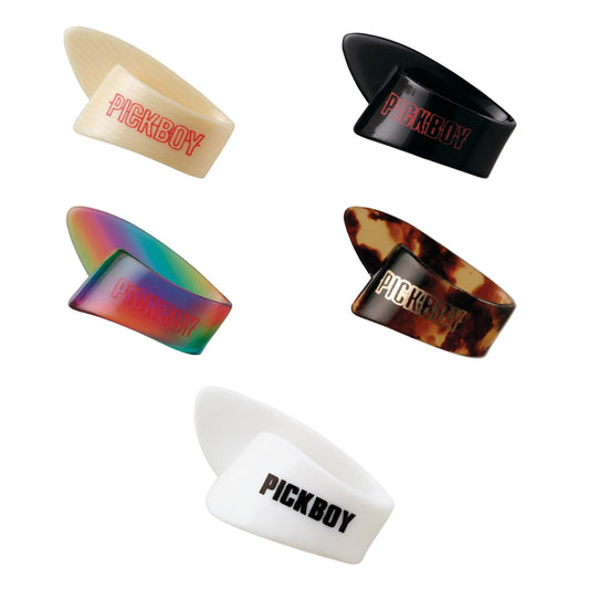 THUMB PICK | Size:M-size, X-large size (white) | Material: Celluloid | Colors: Ivory, Black, Rainbow, Tortoiseshell, White | Each pack contains 5