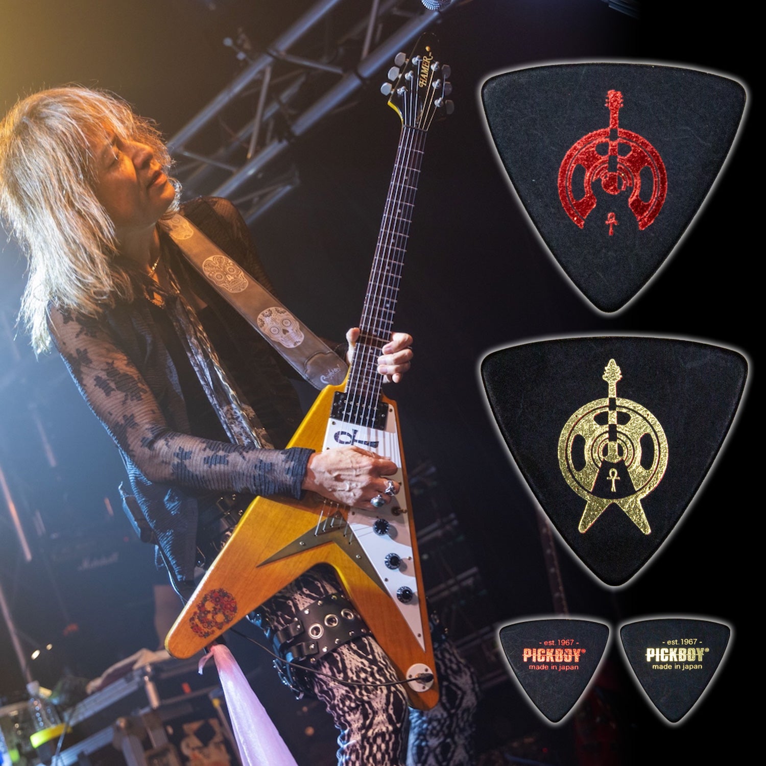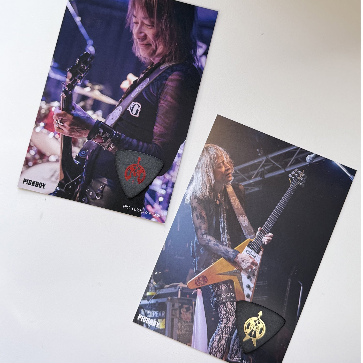 本人使用のギターをモチーフにしたデザインです。 ゴールドはVのヘルギターロゴ、メタリックレッドはフジゲンFLのヘルギターロゴを各10枚のセットです。 裏面のPICKBOYロゴもメタリックレッド、ゴールドとイメージを共有。